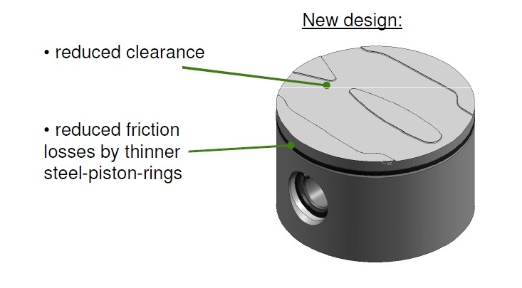 2. Усовершенствованные поршни и шатуны с уменьшенным «мёртвым объёмом». Для ещё большего снижения величины «мёртвого объёма» торцевые поверхности поршней имеют специальный рельеф, позволяющий поршням приближаться к клапанной доске на максимально близкое расстояние, не касаясь лепестков клапанов всасывания.