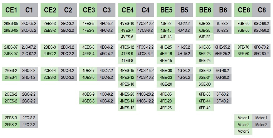 Отдельно стоит отметить использование трёх типов электродвигателей (мотор 1, 2 и 3), что позволяет точно адаптировать компрессор под конкретные условия эксплуатации.
