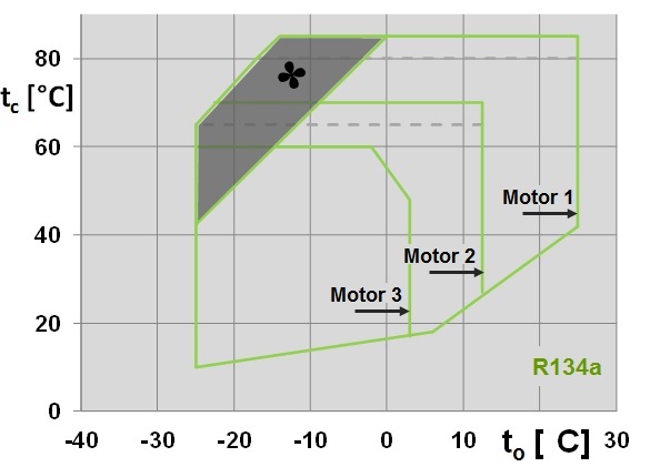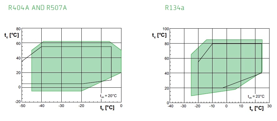 Максимально допустимая температура конденсации увеличена на 7K для моделей с моторами 1 и 2, что повышает устойчивость оборудования при работе в более жёстких условиях. Одновременно для компрессоров с мотором 2 на 5K расширен диапазон температур испарения, что позволяет использовать их не только в низкотемпературных, но и в среднетемпературных системах.