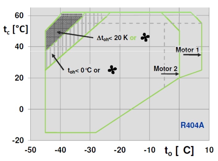 Кроме того, в системах на R404A существенно снижается необходимость использования дополнительного вентилятора обдува головок компрессора. Область, в которой эта опция действительно требуется, смещена к более экстремальным условиям — при температурах конденсации выше +38 °C и испарения около −45 °C, где уже рациональнее применять двухступенчатое сжатие.